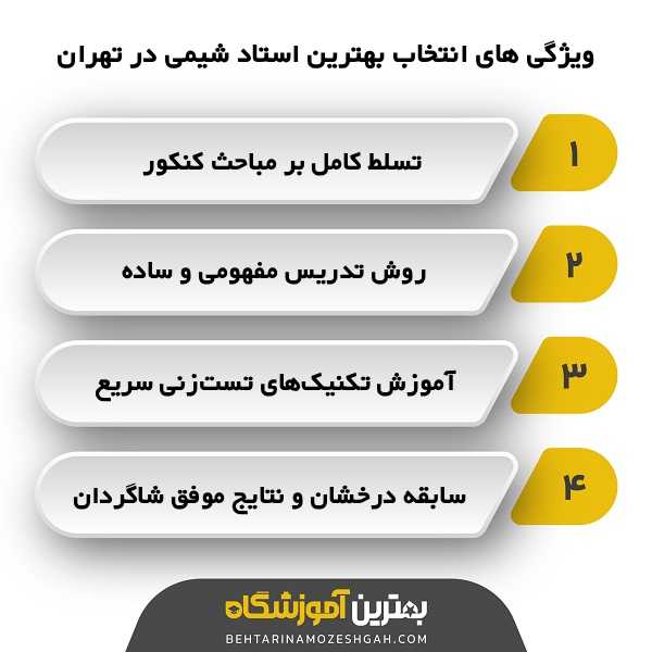 امیدواریم در این مقاله از سایت بهترین آموزشگاه توانسته باشیم به شما در انتخاب بهترین استاد شیمی کنکور در تهران کمک کرده باشیم. یادآوری این نکته ضروری است که انتخاب بهترین استاد شیمی در تهران همراه با انگیزه و پشتکار، شانس شما را برای قبولی در رشتههای برتر چند برابر میکند.