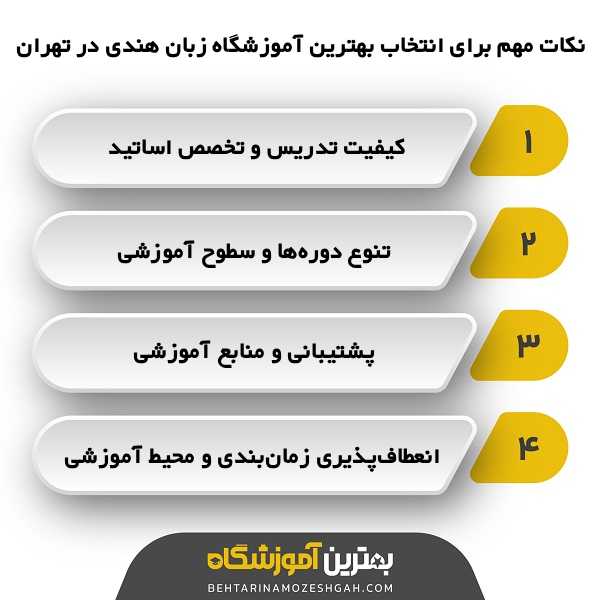 در نهایت، انتخاب بهترین آموزشگاه زبان هندی در تهران، کلید دستیابی به یادگیری سریع، کاربردی و موفقیت در این زبان است. با در نظر گرفتن معیارهایی مانند کیفیت تدریس، تجربه و تخصص اساتید، منابع آموزشی بهروز، پشتیبانی مستمر و برنامهریزی انعطافپذیر، میتوانید مرکزی را بیابید که دقیقاً متناسب با اهداف و نیازهای شما باشد. سرمایهگذاری روی یادگیری زبان هندی، گامی ارزشمند برای گسترش فرصتهای شغلی، تحصیلی و ارتباطات بینالمللی است. همین امروز اقدام کنید و با ثبتنام در یک آموزشگاه معتبر، مسیر آشنایی با دنیای شگفتانگیز فرهنگ و زبان هندوستان را آغاز کنید.